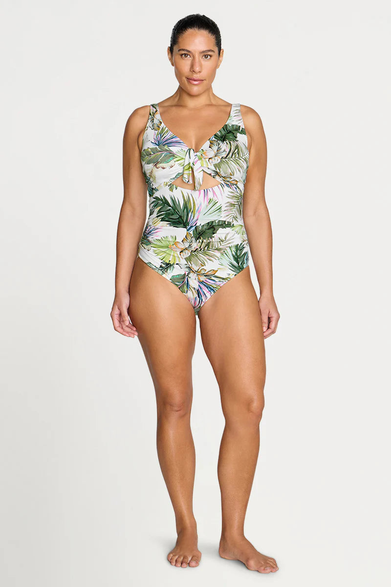 Artesands fits your curves. Make a curve statement in our Artesands Cezanne plus size one piece, the most flattering swimsuit shape EVER. Our Cezanne one piece has a mock knot tie at the front that covers a full internal cup support system. Our Cezanne shape is an underwire style with full foam cups that create great bust shape for a D cup, DD cup and E cup. But it is the peep hole on this style that creates the most amazing figure flattering illusion. The peephole creates a body enhancing hourglass shape and when paired back with our full body 360 degree powermesh and our front panel ruching this style is truly flattering. Cezanne has good moderate bottom coverage.