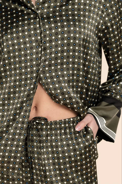 Crafted from luxurious silky satin, the Scarlett PJ Set features a playful mix of prints that blend nightwear with daywear. With a relaxed-fit button-through shirt finished with contrast printed cuffs and wide-leg pants, this set drapes beautifully and feels just as good as it looks.