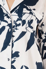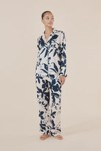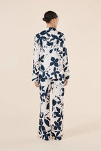 Crafted from silky satin, this set features a delicate navy floral print on an ivory base, offering a sophisticated yet feminine look. The button-through long-sleeve top includes a chest pocket, while the wide-leg pants have a waist tie for an adjustable fit. Designed for both lounging and sleeping, this set is the perfect blend of style and ease, made to be worn and loved on repeat.