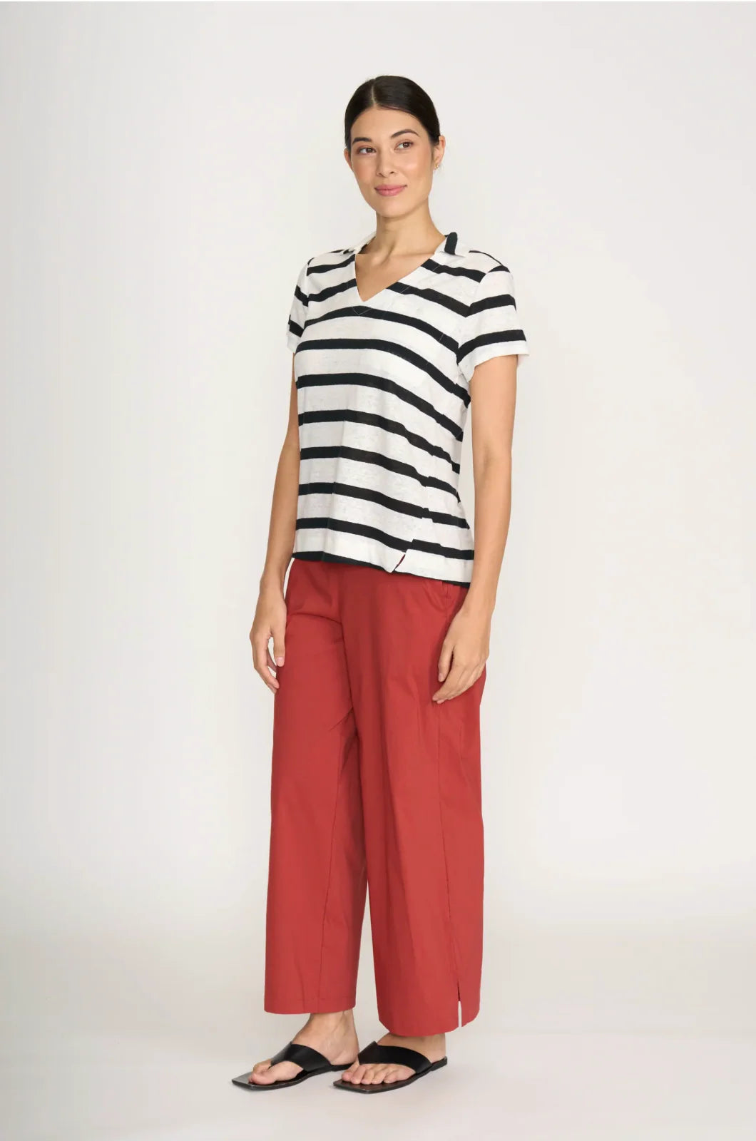 The Foil Broad Horizons Trapeze Pant offers comfort and style with its flat front waistband and elastised back for easy pull-on wear. Crafted from a light cotton mix with slight stretch fabric, these pants feature wide legs and a 10cm deep split at the hem, allowing for effortless movement. Practical side seam pockets add convenience, making these pants a versatile new addition to your wardrobe.