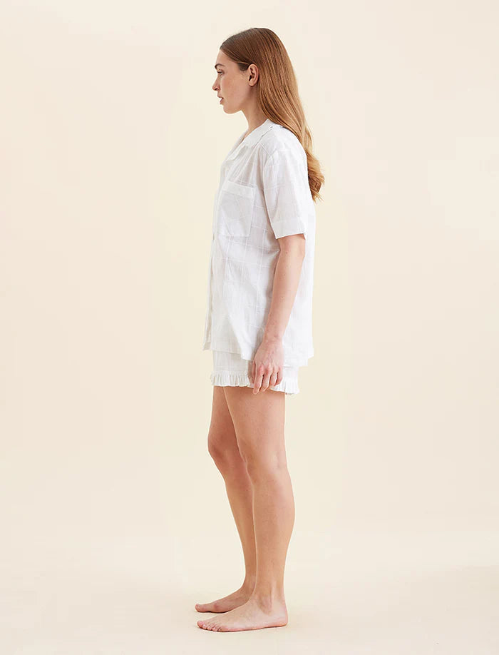 Slip into effortless charm with the Ivy Organic Cotton Frill Short Sleeve Boxer PJ. Made from 100% Organic Cotton, this set offers a soft, breathable feel that’s perfect for keeping you cool and comfortable all night. The short-sleeved top with delicate frill detailing adds a feminine touch, while the relaxed boxer-style shorts provide the ultimate ease and comfort.