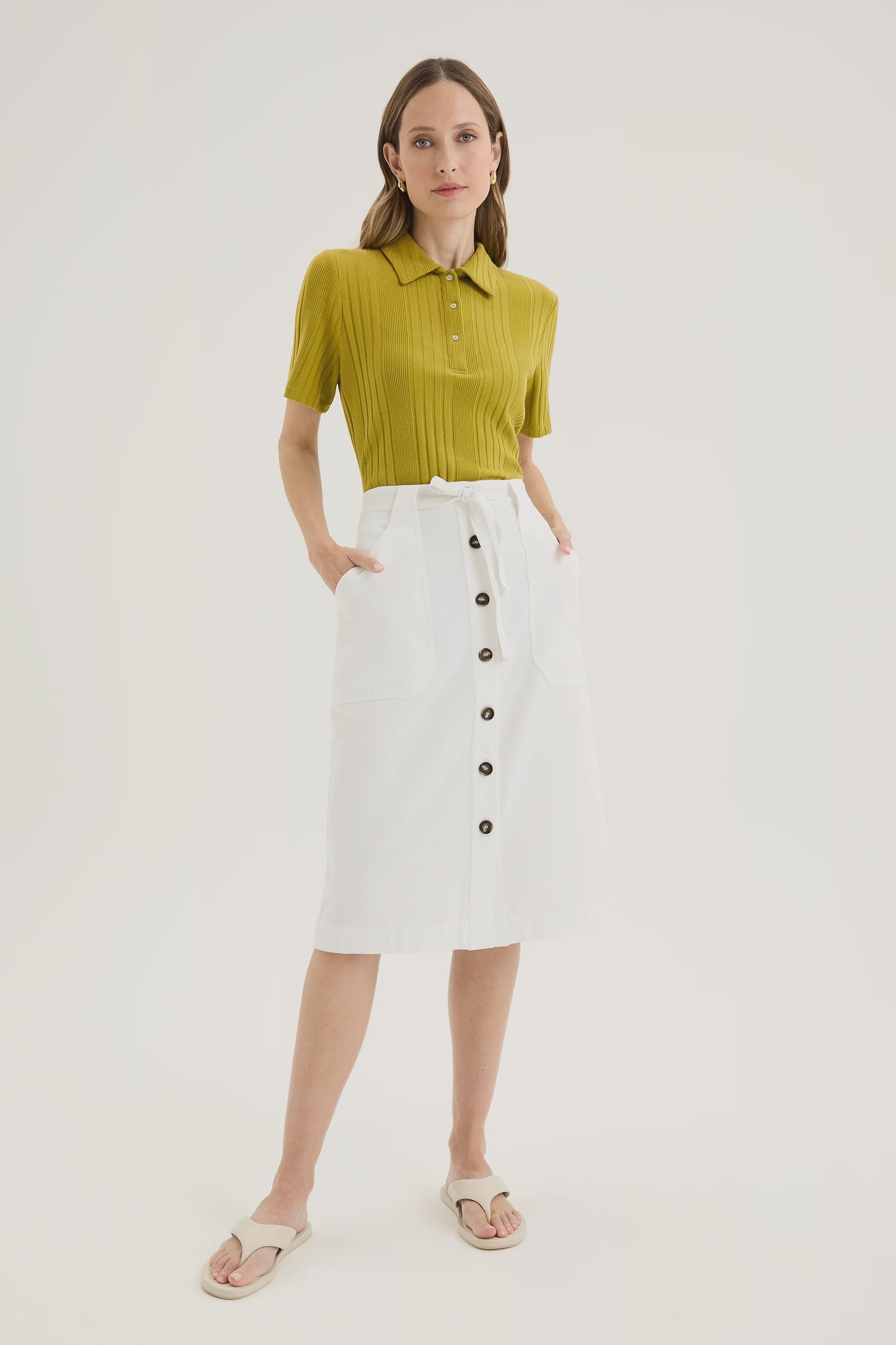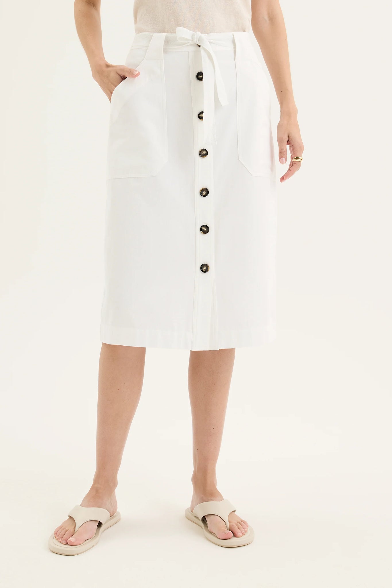 The Panna Skirt offers a refined take on utility-inspired styling, crafted from 100% cotton with a structured yet breathable feel. Designed in a clean, straight silhouette that falls to mid-calf, it features a full button-through front and angular patch pockets for a considered, functional finish. The waistband is detailed with belt loops and a herringbone tie, allowing for subtle waist definition while keeping the look relaxed. Timeless and versatile, this midi skirt transitions easily from everyday errands to elevated outfitting.