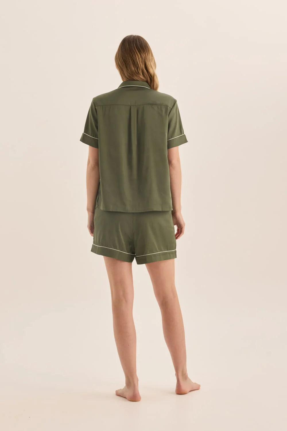 The Sonia pyjama set in olive by Gingerlilly. Explore comfort and elegance with our olive pyjama set. This set includes a button-through top with drop sleeves and stylish white contrast piping, paired with relaxed shorts for a modern sleepwear ensemble. Mix and match the top and shorts with other sleepwear pieces or incorporate them into your everyday wardrobe for versatile styling options. Ideal for lounging or a restful night's sleep, embrace the sophistication of Gingerlilly sleepwear.