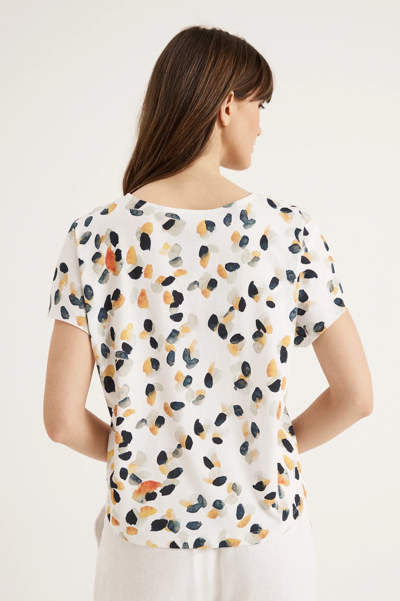 A playful take on the classic cotton tee. The Tantra Tee is crafted from 100% recycled cotton with a relaxed fit that offers all-day comfort and ease. This short sleeve women's t-shirt features a crew neckline, extended cap sleeves for a flattering shoulder line, and an exclusive dotted print in soft tones of blue and yellow against a crisp white base. The artistic print elevates this casual tee beyond basics - style with denim and sneakers for effortless weekend wear, tuck into linen trousers for relaxed sophistication, or layer under a blazer for contemporary contrast. A sustainable cotton t-shirt and versatile wardrobe piece that brings colour and character to everyday dressing.