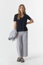 Our 5 Pocket Crop Wide Leg Jean in white and navy is made from a new yarn-dyed cotton with a fine narrow stripe and a touch of stretch. The cropped wide-leg cut gives a fresh update to a classic shape, easy to style with shirts, tees or knits.