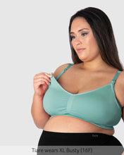 The Busty version has a hidden inside support panel designed to support the larger bust. This is a soft support style with no seams for the ultimate in comfort, and a flexible fit that will expand 2-3 cup sizes to offer total comfort and flexibility for your changing size throughout your pregnancy and for postpartum changes